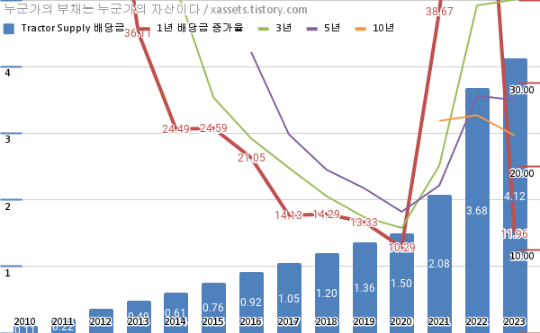 트랙터 서플라이 배당금 및 배당성장률 차트 (2010년~2023년)