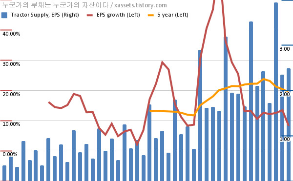 - 포스팅일 기준, 트랙터 서플라이의 1, 5년 연평균 EPS 성장률은 8.24%, 19.46%이다.