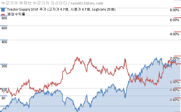 트랙터 서플라이 배당수익률 및 주가 상승률 차트 (2013년~2023년)
