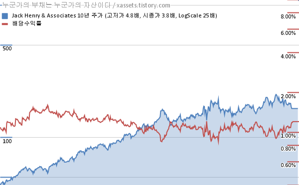 잭 헨리 앤 어소시에이츠 배당수익률 및 주가 상승률 차트 (2013년~2023년)