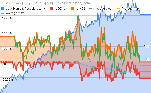 - 잭 헨리 앤 어소시에이츠의 10년 평균 MDD는 -6.71%고, 52주 최저가 대비 평균 상승률은 22.82%다.