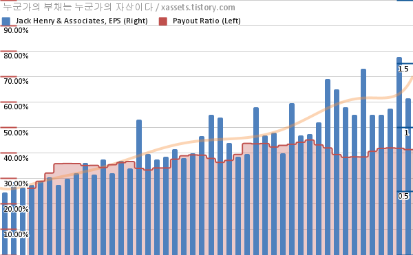 잭 헨리 앤 어소시에이츠 EPS 성장률, 배당성향 차트 (2012년~2023년)