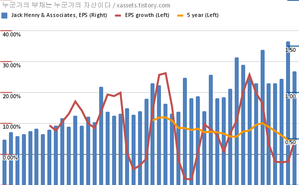 - 포스팅일 기준, 잭 헨리 앤 어소시에이츠의 1, 5년 연평균 EPS 성장률은 4.36%, 4.74%이다.