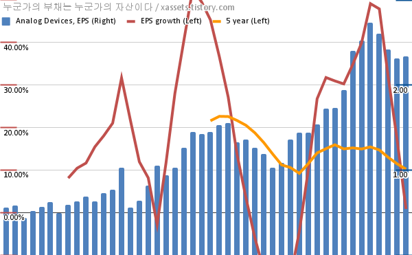 - 포스팅일 기준, 아날로그 디바이스의 1, 5년 연평균 EPS 성장률은 0.83%, 10.20%이다.
