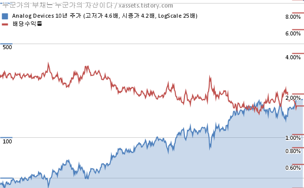 - 포스팅일 기준, 아날로그 디바이스의 1, 3, 5, 10년 연평균 주가상승률은 20.87%, 16.45%, 16.49%, 15.66%이다.