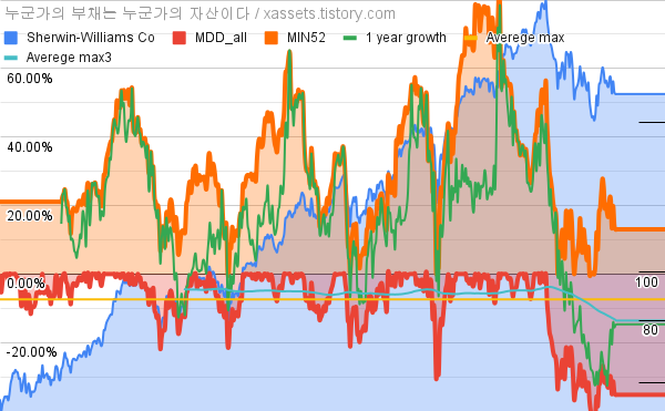 - 셔윈 윌리엄즈의 10년 평균 MDD는 -7.39%고, 52주 최저가 대비 평균 상승률은 31.90%다.