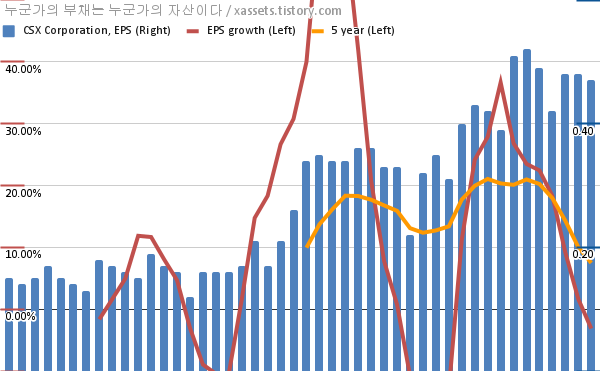 - 포스팅일 기준, CSX 주식회사의 1, 5년 연평균 EPS 성장률은 -3.14%, 7.48%이다.
