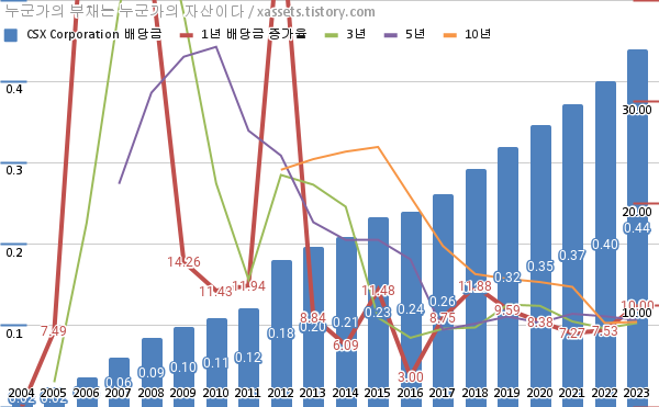 CSX 주식회사 배당금 및 배당성장률 차트 (2004년~2023년)