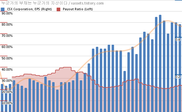 CSX 주식회사 EPS 성장률, 배당성향 차트 (2012년~2023년)