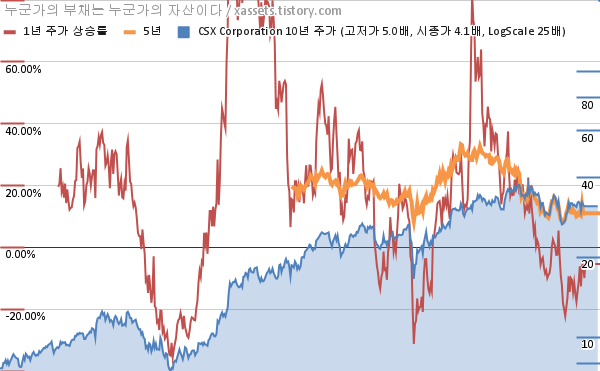 - 포스팅일 기준, CSX 주식회사의 1, 3, 5, 10년 연평균 주가상승률은 -9.95%, 5.58%, 10.89%, 15.08%이다.