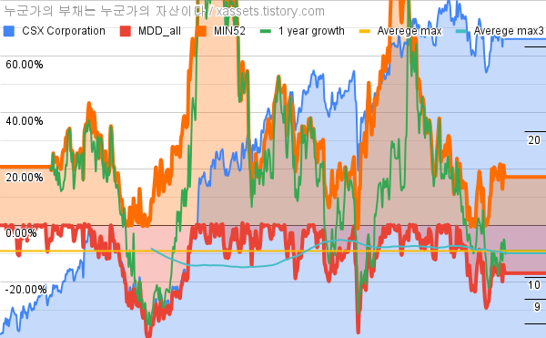 - CSX 주식회사의 10년 평균 MDD는 -9.12%고, 52주 최저가 대비 평균 상승률은 34.55%다.
