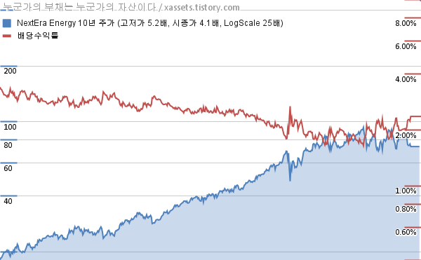넥스테라 에너지 배당수익률 및 주가 상승률 차트 (2013년~2023년)
