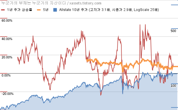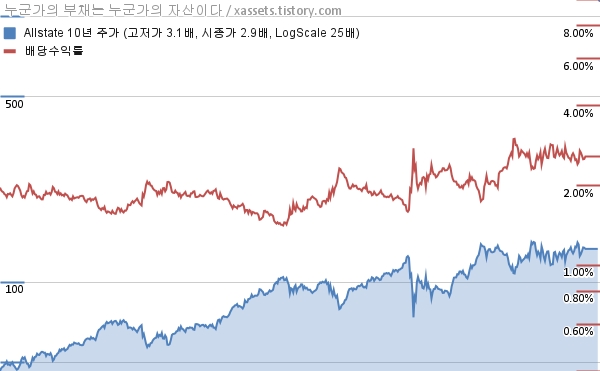 - 포스팅일 기준, 올스테이트의 1, 3, 5, 10년 연평균 주가상승률은 7.28%, 2.99%, 7.43%, 11.29%이다.