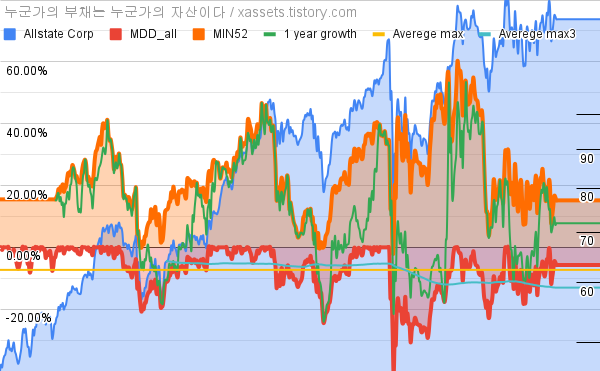 - 올스테이트의 10년 평균 MDD는 -7.27%고, 52주 최저가 대비 평균 상승률은 24.41%다.