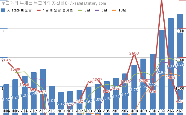 올스테이트 배당금 및 배당성장률 차트 (2004년~2023년)