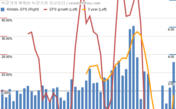 - 포스팅일 기준, 올스테이트의 1, 5년 연평균 EPS 성장률은 -751.82%, -2.24%이다.