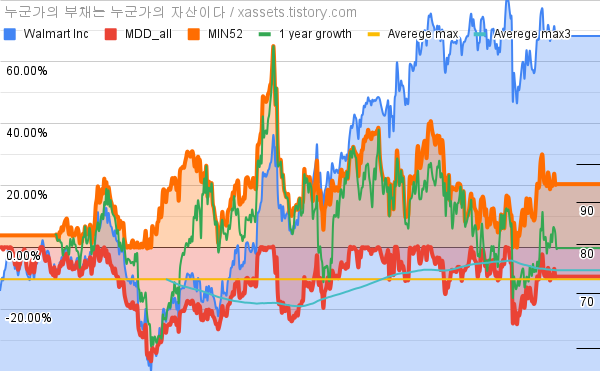 - 월마트의 10년 평균 MDD는 -10.32%고, 52주 최저가 대비 평균 상승률은 18.11%다.