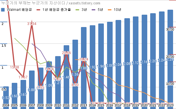 월마트 배당금 및 배당성장률 차트 (2004년~2023년)