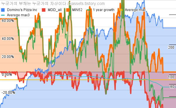 - 도미노피자의 10년 평균 MDD는 -8.67%고, 52주 최저가 대비 평균 상승률은 35.97%다.