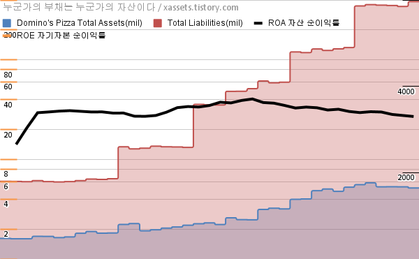 도미노피자 자산 부채 차트 (2013년~2022년)