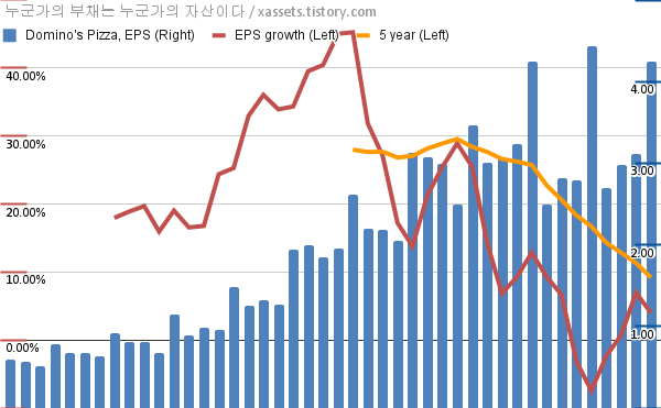 - 포스팅일 기준, 도미노피자의 1, 5년 연평균 EPS 성장률은 3.99%, 9.17%이다.