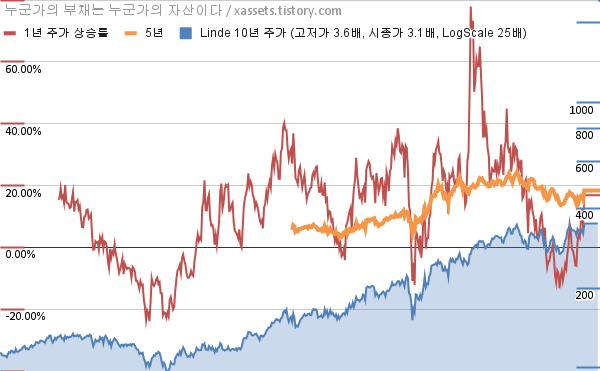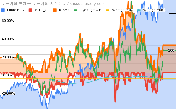- 린데의 10년 평균 MDD는 -6.75%고, 52주 최저가 대비 평균 상승률은 23.05%다.