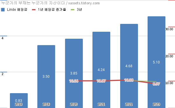 - 린데의 2023년 기준 1, 3년 연평균 배당성장률은 8.97%, 9.81%이다.