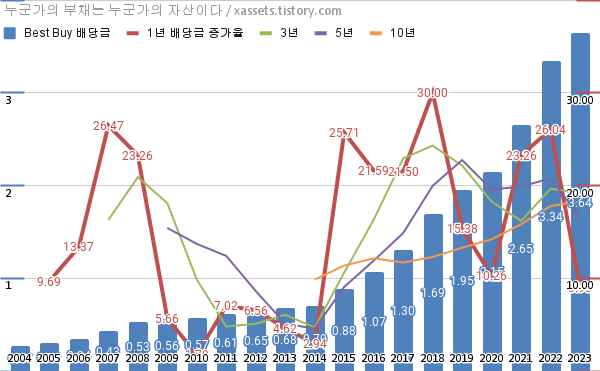 베스트 바이 배당금 및 배당성장률 차트 (2004년~2023년)