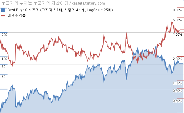 - 포스팅일 기준, 베스트 바이의 1, 3, 5, 10년 연평균 주가상승률은 -21.53%, 4.09%, 2.44%, 14.53%이다.