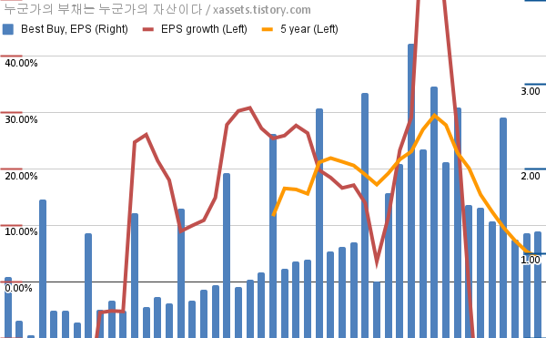 - 포스팅일 기준, 베스트 바이의 1, 5년 연평균 EPS 성장률은 -13.16%, 4.30%이다.