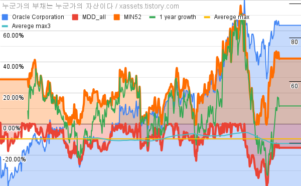 - 오라클의 10년 평균 MDD는 -9.57%고, 52주 최저가 대비 평균 상승률은 22.47%다.