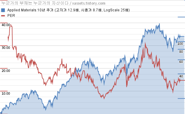 어플라이드 머티어리얼즈 PER 차트 (2013년~2023년)