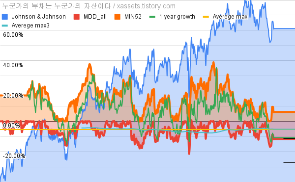 - 존슨앤존슨의 10년 평균 MDD는 -5.38%고, 52주 최저가 대비 평균 상승률은 14.88%다.