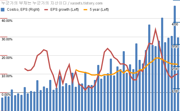 - 포스팅일 기준, 코스트코의 1, 5년 연평균 EPS 성장률은 10.07%, 15.23%이다.