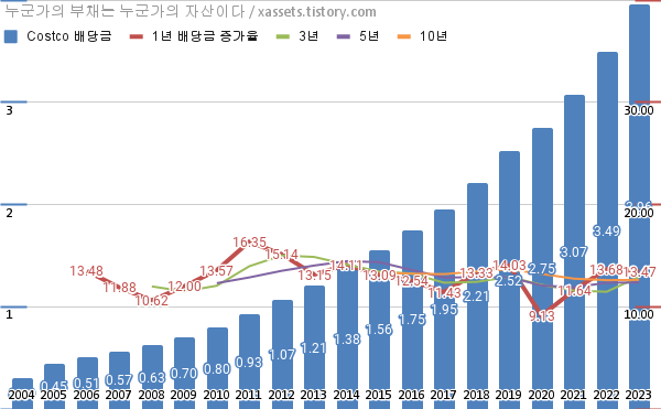 코스트코 배당금 및 배당성장률 차트 (2004년~2023년)