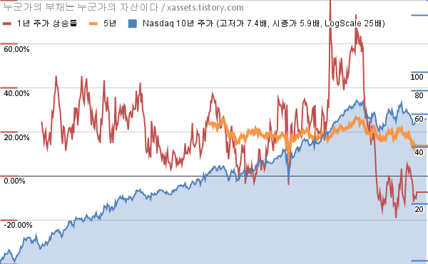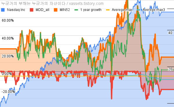 - 나스닥의 10년 평균 MDD는 -5.36%고, 52주 최저가 대비 평균 상승률은 30.83%다.