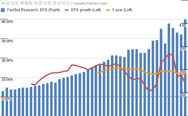 - 포스팅일 기준, 팩트셋 리서치의 1, 5년 연평균 EPS 성장률은 6.64%, 11.26%이다.