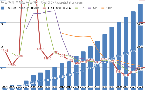 팩트셋 리서치 배당금 및 배당성장률 차트 (2004년~2023년)