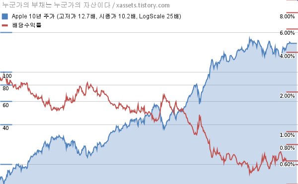 - 전형적인 성장 끝자락의 기업은 배당성장률이 낮아짐에도 배당수익률이 높아지는 경우가 많다. 하지만 애플은 아직까지는 그런 모습을 보이지는 않고 있다. 오히려 배당수익률이 더 낮아지지 않을까 하는 생각도 든다.