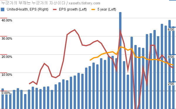 - 포스팅일 기준, 유나이티드헬스의 1, 5년 연평균 EPS 성장률은 12.57%, 14.18%이다.