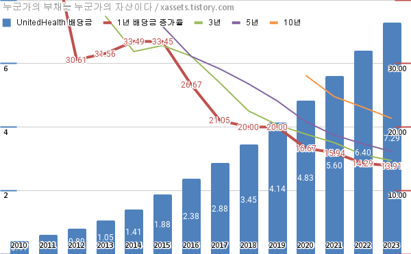 - 유나이티드헬스의 2023년 기준 1, 3, 5, 10년 연평균 배당성장률은 13.91%, 14.71%, 16.14%, 21.35%이다.