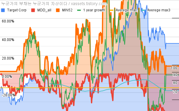 - 타깃의 10년 평균 MDD는 -14.85%고, 52주 최저가 대비 평균 상승률은 35.08%다.