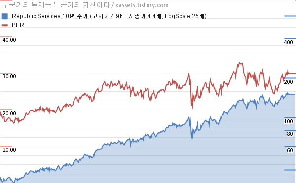 - 포스팅일 기준, 리퍼블릭 서비스의 1, 3, 5, 10년 연평균 주가상승률은 9.26%, 20.19%, 15.83%, 15.84%이다.
