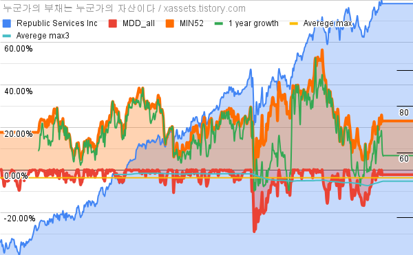 - 리퍼블릭 서비스의 10년 평균 MDD는 -3.65%고, 52주 최저가 대비 평균 상승률은 23.24%다.