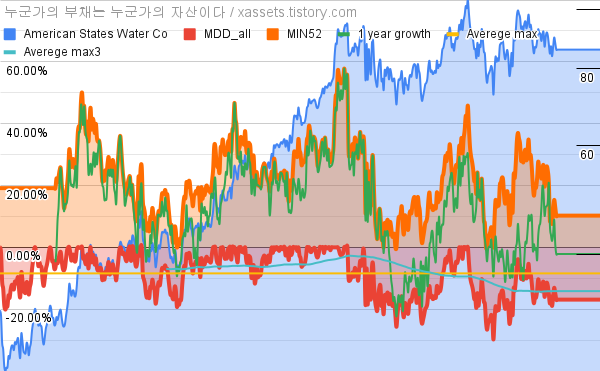 - 아메리칸 스테이츠 워터의 10년 평균 MDD는 -8.42%고, 52주 최저가 대비 평균 상승률은 22.81%다.