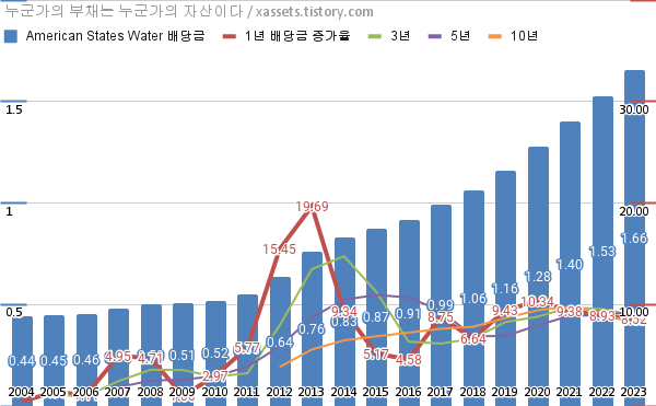 아메리칸 스테이츠 워터 배당금 및 배당성장률 차트 (2004년~2023년)