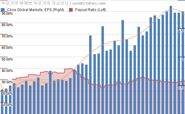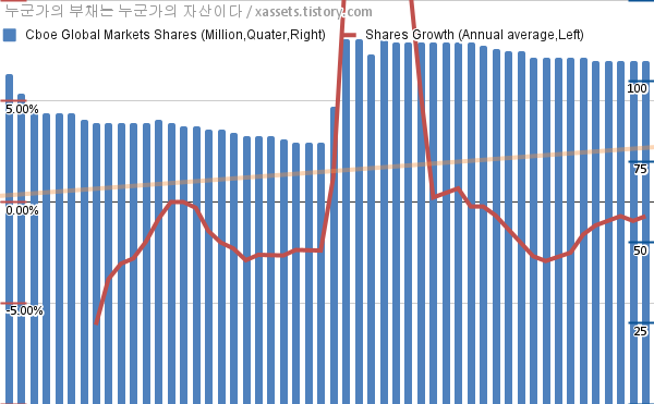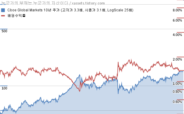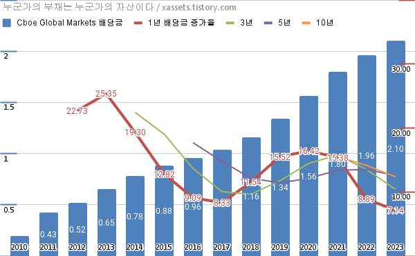 - 지난 2023년 8월 16일에 씨보 글로벌 마켓 Cboe Global Markets (BATS:CBOE)이 배당금 증액을 공시했다. 분기당 배당금이 $0.5에서 $0.55로 전 분기 대비 10.00% 증가하고, 연간 지급 배당금은 전년도 대비 7.14% 증가한다.