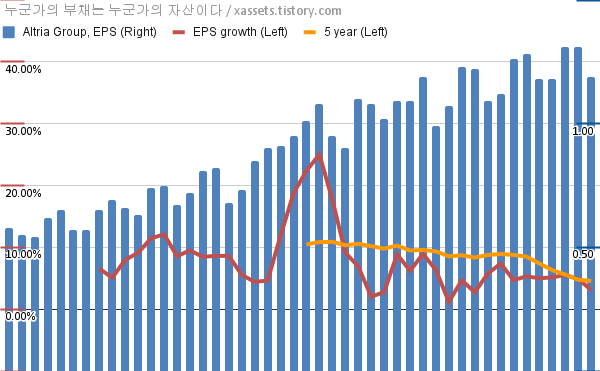 - 포스팅일 기준, 알트리아 그룹의 1, 5년 연평균 EPS 성장률은 3.10%, 4.57%이다.