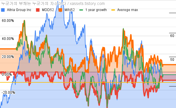 - 알트리아 그룹의 10년 평균 MDD는 고, 52주 최저가 대비 평균 상승률은 18.93%다.