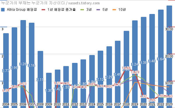 - 알트리아 그룹의 2023년 기준 1, 3, 5, 10년 연평균 배당성장률은 4.40%, 3.98%, 5.85%, 7.76%이다.
